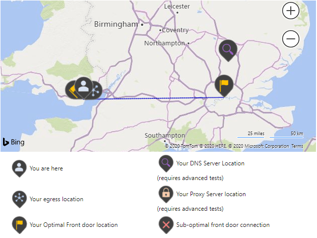 This is the Microsoft recommended configuration – local internet breakout, no VPN. As the map shows, now all my traffic stay in the country: breakout in Cardiff, DNS in London and Microsoft 365 Front Door in London. The most ideal case.