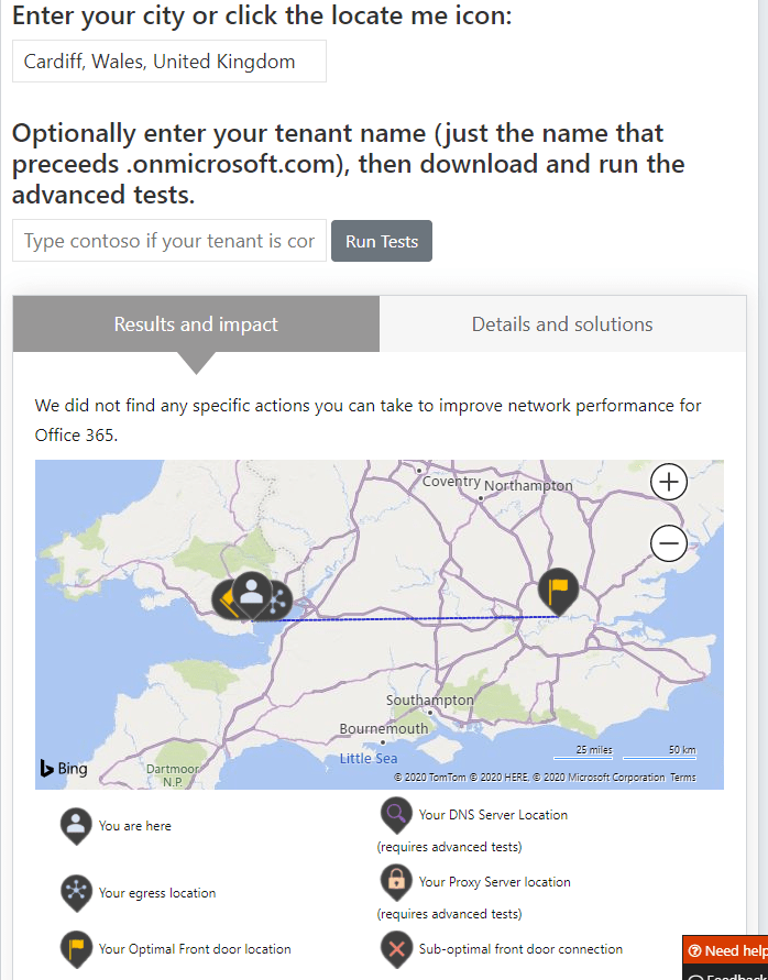 As the map shows: I’m in Cardiff but breaking out to the internet from London (our datacentre) and my DNS server is all the way in Belgium. This resulted my Microsoft 365 Front Door being in the Netherlands (a bit strange). So, not ideal!